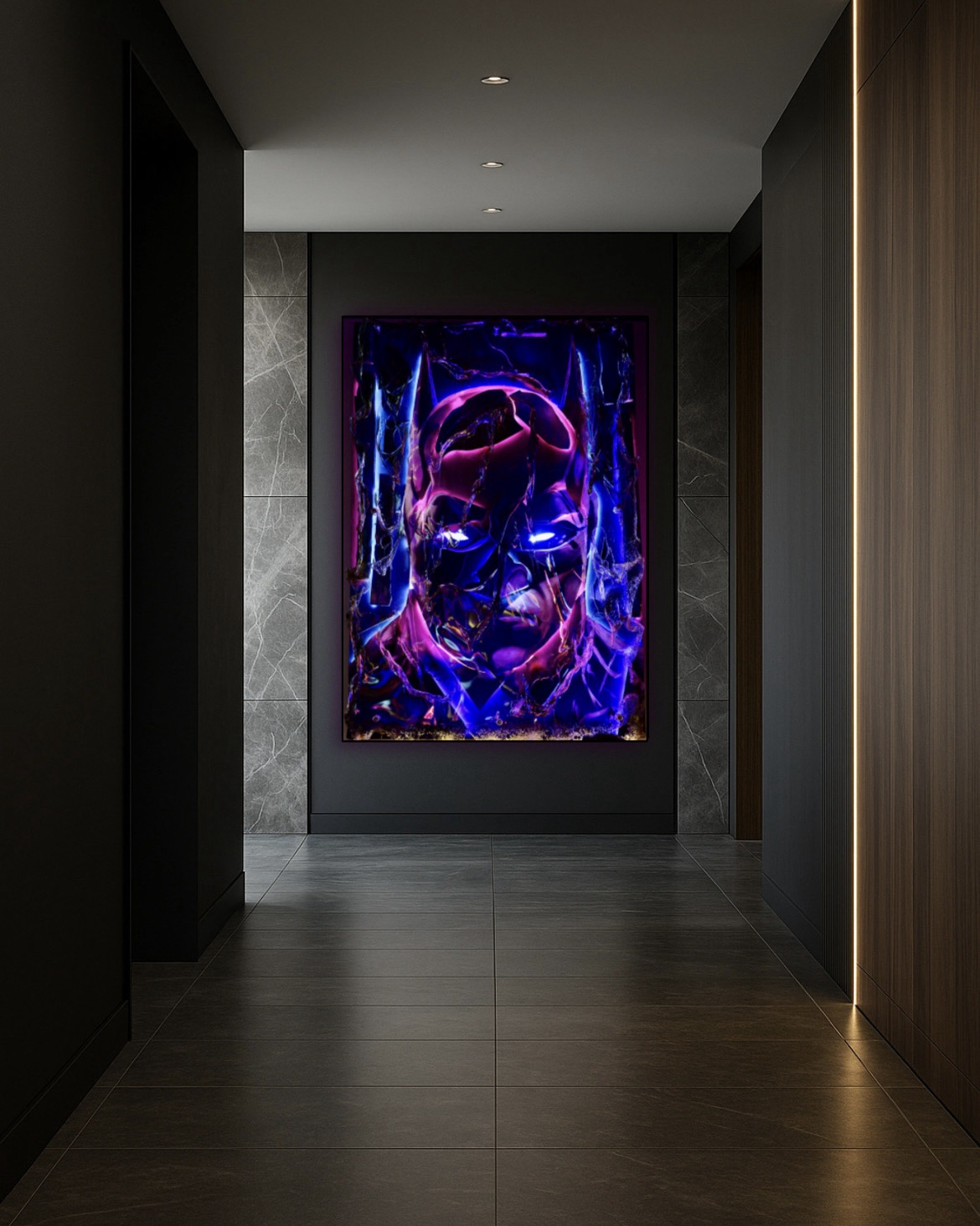 Le tonalità blu e viola, attraversate da tagli di neon, costruiscono un forte contrasto con le zone d’ombra, evocando la dualità del personaggio: forza e fragilità, giustizia e oscurità. Le crepe e i rilievi della materia riflettono una tensione interna, trasformando l’immagine in un’energia sospesa tra luce e notte.