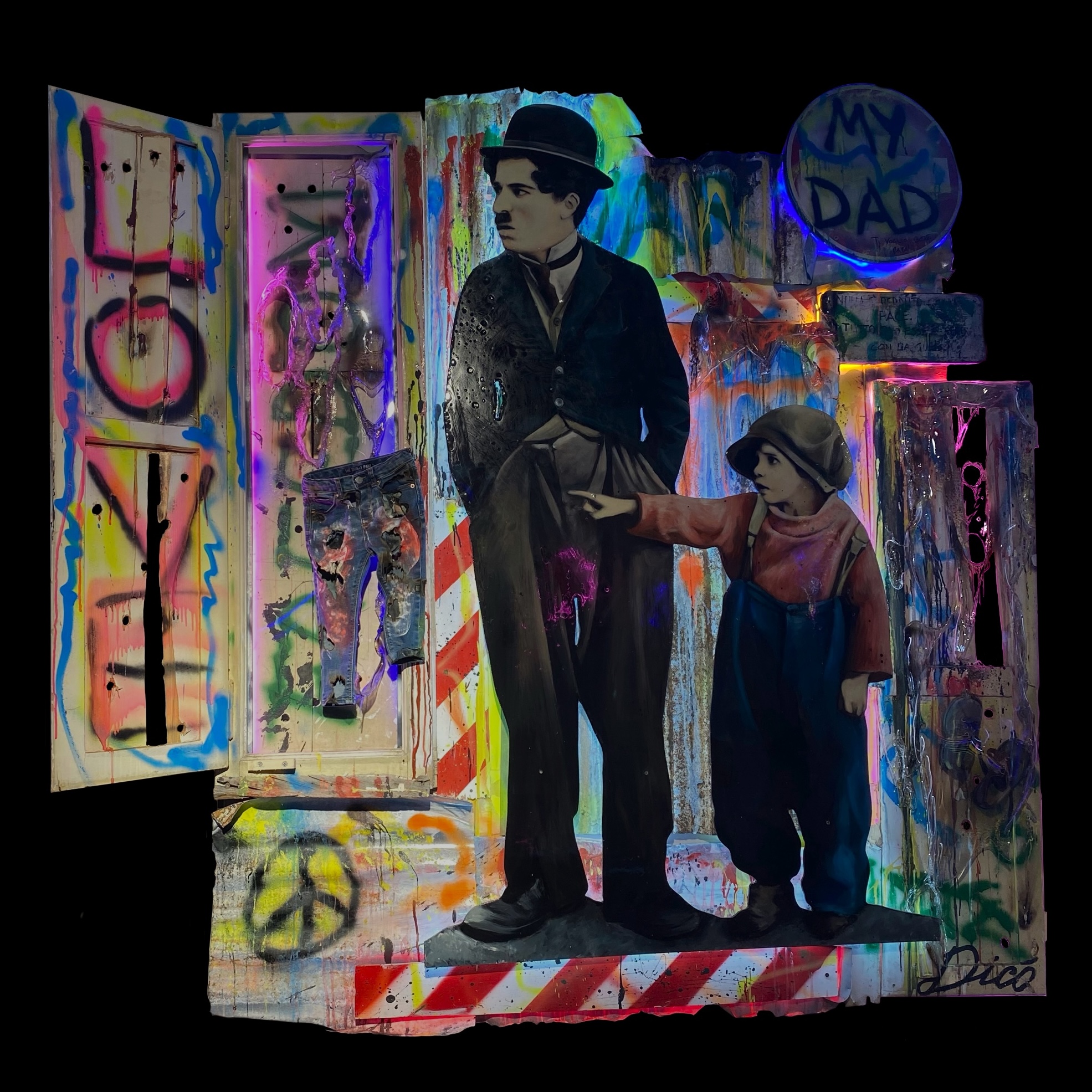 Quest’opera è una reinterpretazione contemporanea di una celebre scena del cinema muto, trasformata da Dicò in un’immagine densa di emozione e simbolismo. Le figure in bianco e nero emergono da una scenografia urbana costruita con materiali veri, recuperati e integrati nella composizione: legno consumato dal tempo, segnali stradali e oggetti che portano con sé storie vissute. Tra questi, i pantaloni reali del bambino aggiungono tridimensionalità e una presenza quasi tangibile.