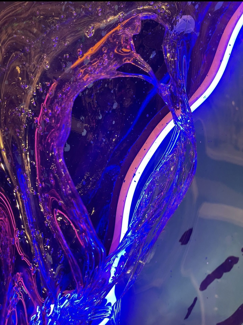 La figura emerge dalla superficie attraverso un segno luminoso continuo, che ne definisce il profilo come una traccia di luce sospesa tra pittura e installazione. La materia si stratifica in colature, trasparenze e interventi plastici, creando una superficie complessa, dinamica, tridimensionale, in cui luce e colore non sono elementi decorativi ma strutture portanti dell’opera.