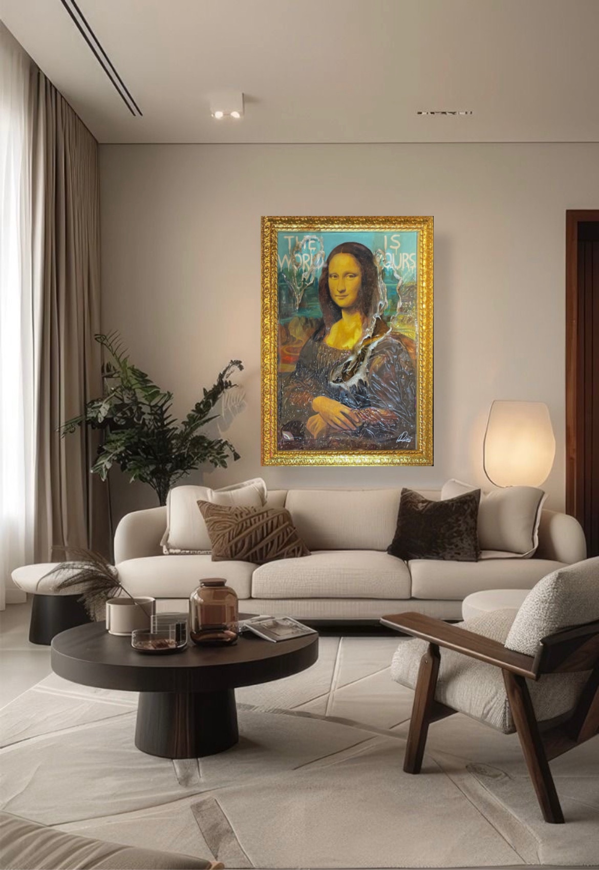 In questa reinterpretazione contemporanea della Mona Lisa, Dicò fonde la delicatezza del capolavoro rinascimentale con la forza materica e luminosa del suo linguaggio artistico. L’immagine, realizzata su un supporto in legno e arricchita da inserti in stoffa e resina, viene attraversata da segni di combustione e colature che ne trasformano la superficie in un rilievo vivo e dinamico.