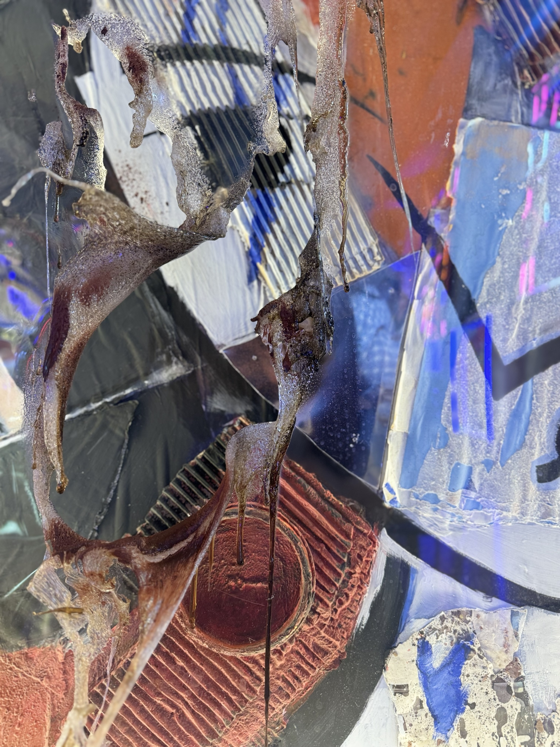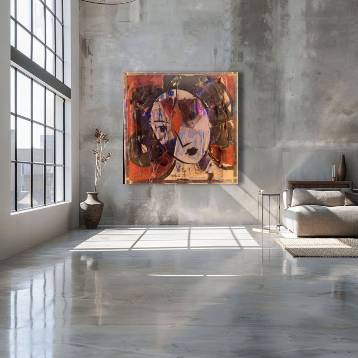 L’opera si sviluppa come una superficie viva, costruita per sovrapposizioni di materiali, inserti e interventi pittorici che creano profondità e movimento. Le forme frammentate e ricomposte evocano la memoria della tradizione artistica, mentre le cromie calde e vibranti — tra oro, rosso e tonalità terrose — donano all’insieme una forte presenza scenica.