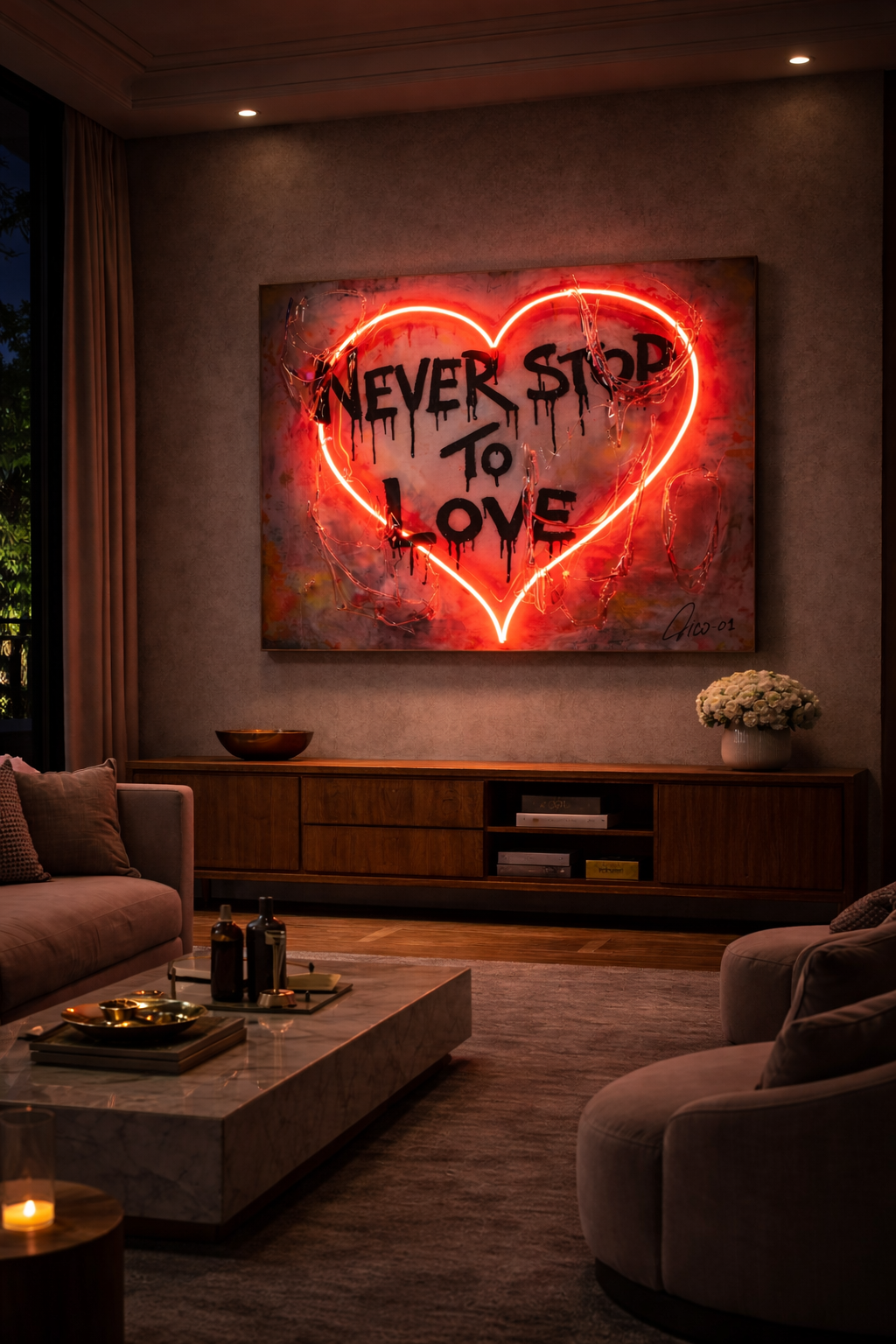 Never Stop to Love non è solo un messaggio romantico, ma un’affermazione esistenziale. Un’opera che parla di resistenza emotiva, di continuità, di amore come scelta quotidiana. Pensata per abitare lo spazio e trasformarlo, diventa un segno che resta, capace di illuminare l’ambiente e di ricordare, ogni giorno, che amare è un atto radicale e necessario.