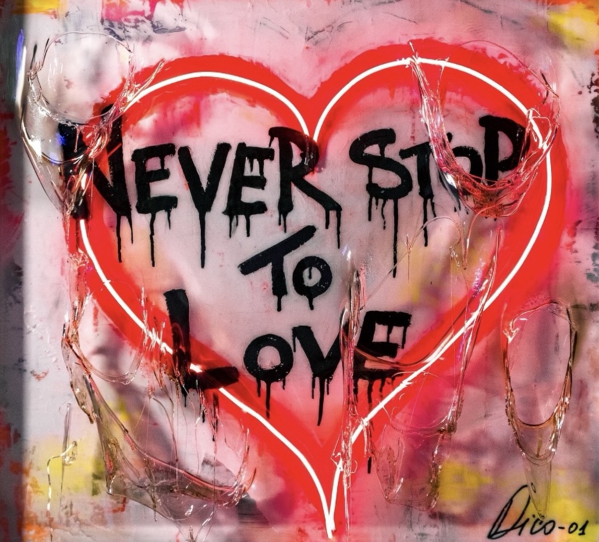 Never Stop to Love è una dichiarazione intensa e senza filtri, un invito a non interrompere mai il gesto dell’amore, nemmeno quando diventa fragile, imperfetto o faticoso. Il cuore al neon rosso pulsa al centro dell’opera come un battito vivo, mentre la scritta, colata e irregolare, sembra emergere dalla materia con urgenza, quasi fosse stata tracciata di getto, seguendo l’emozione del momento.