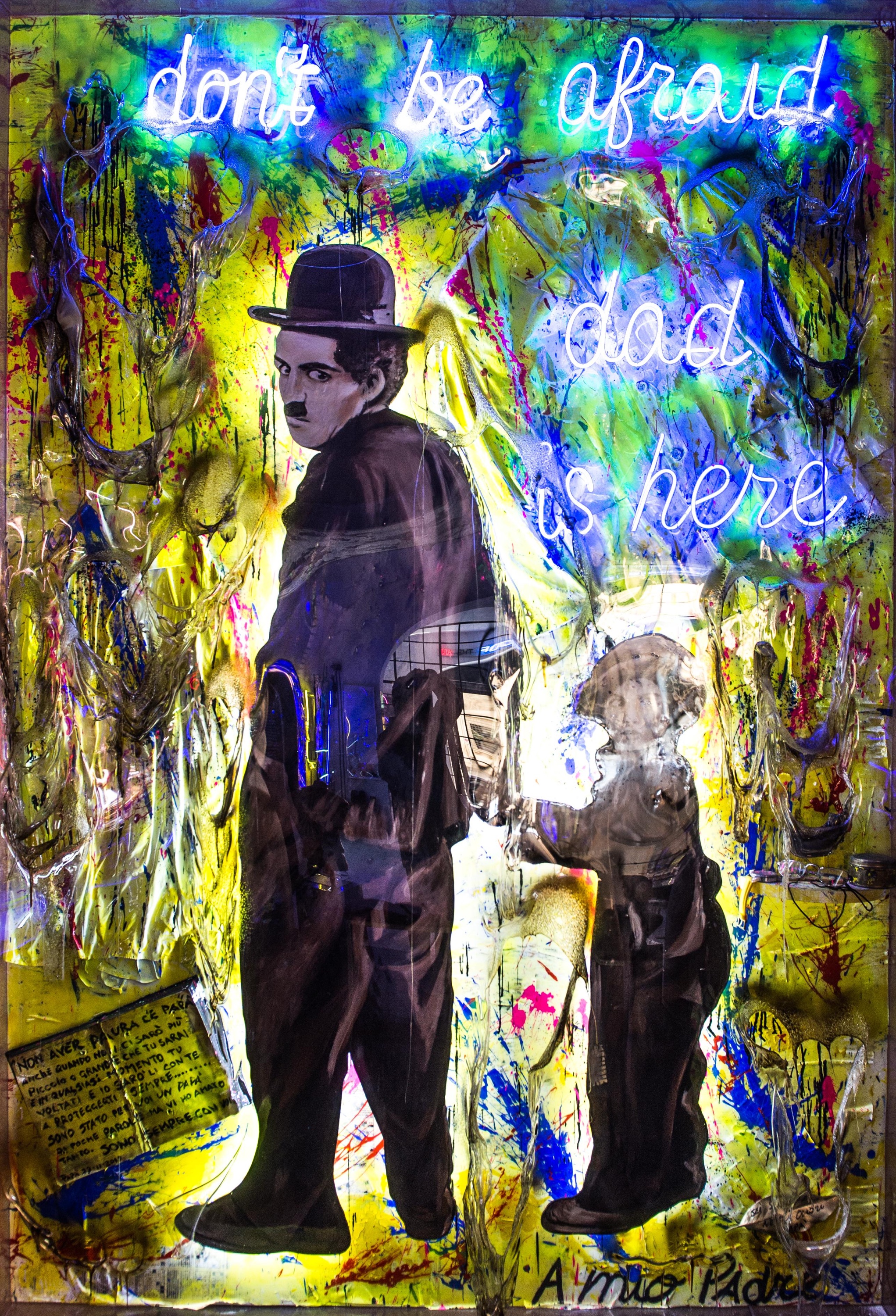 L’immagine centrale ritrae Charlie Chaplin e un bambino, richiamando il film Il monello (The Kid), metafora del rapporto padre-figlio. Il fondo dell’opera è esplosivo, con colori vivaci e colature di resina che aggiungono profondità e dinamismo. La frase al neon “don’t be afraid, dad is here” enfatizza il senso di protezione e amore paterno.